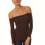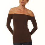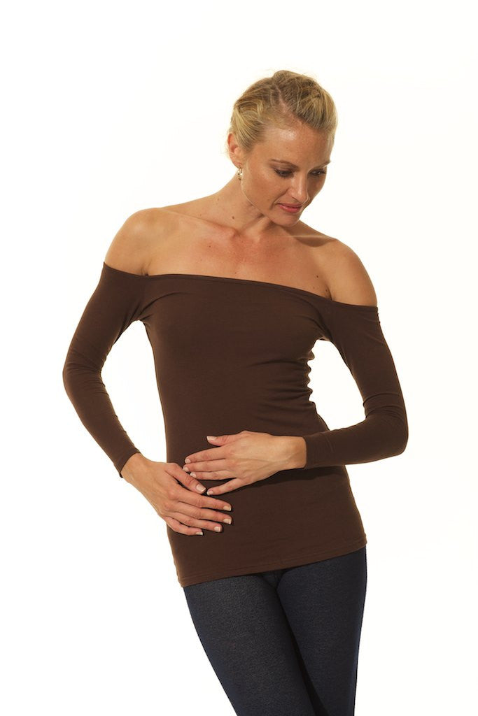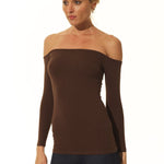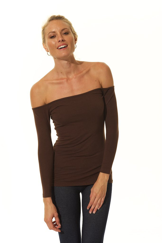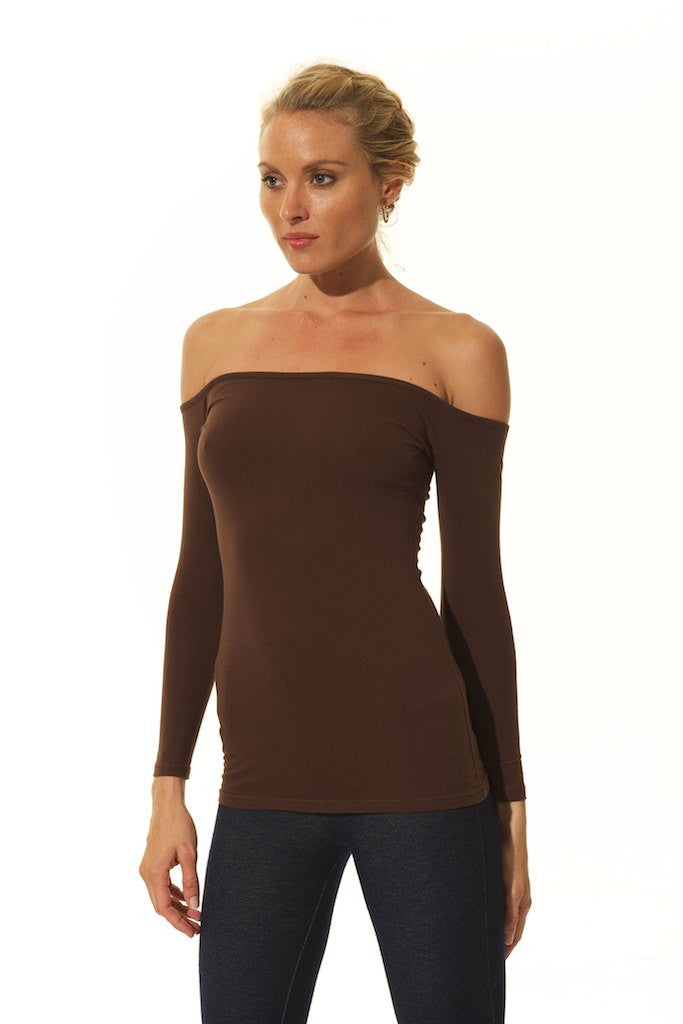 Elegant Off the shoulder fitted top to accentuate the shoulders .