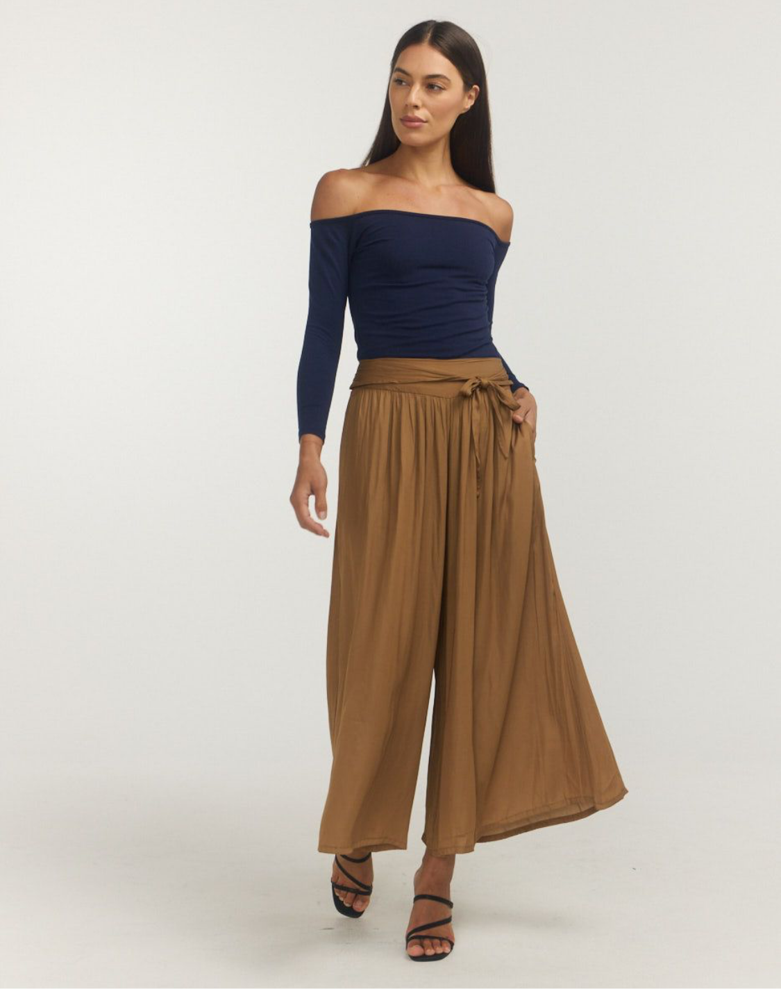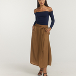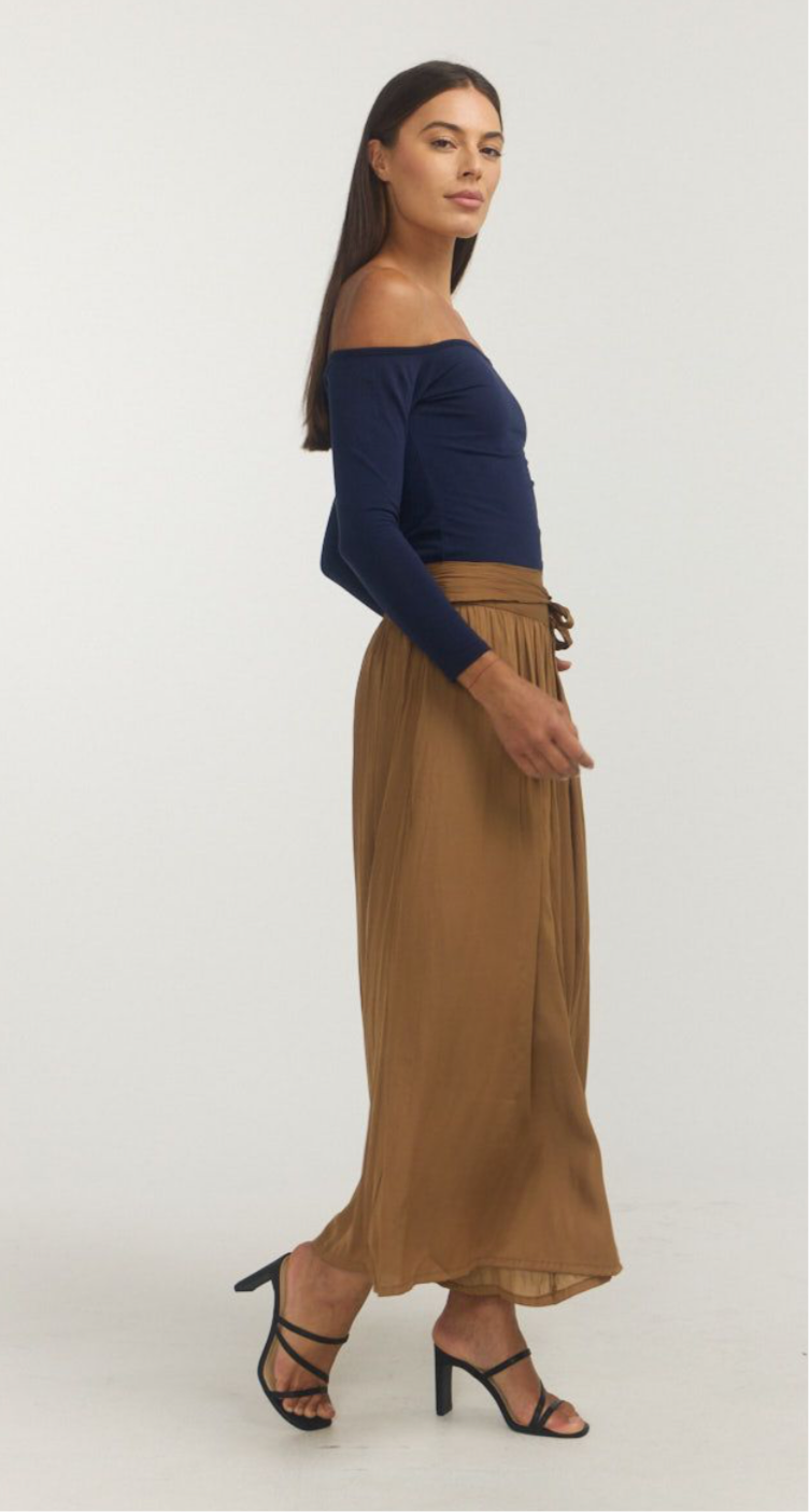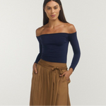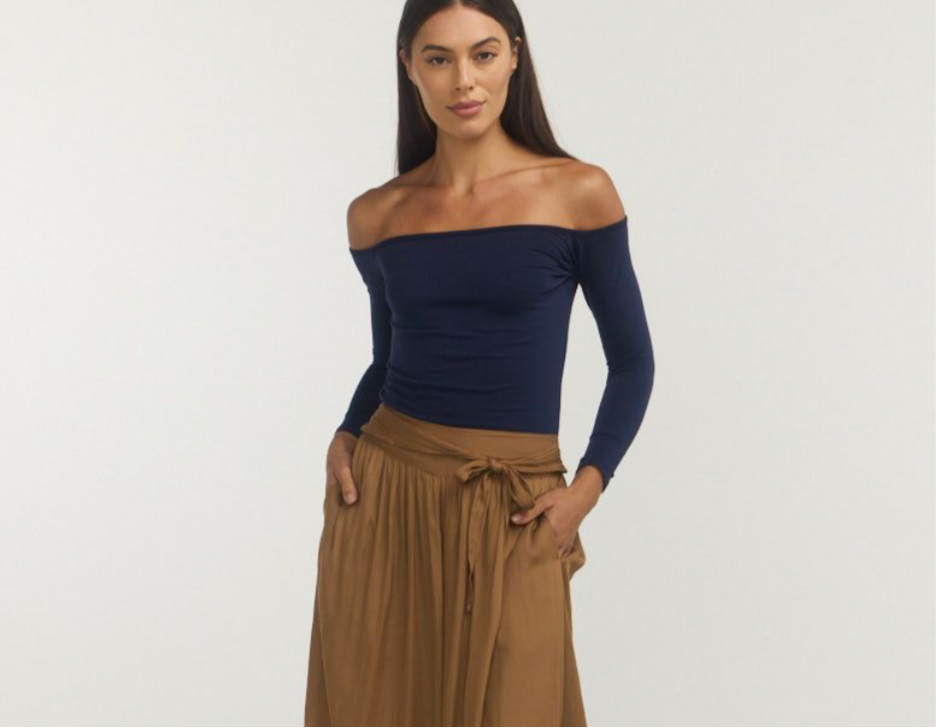 Elegant Off the shoulder fitted top to accentuate the shoulders .