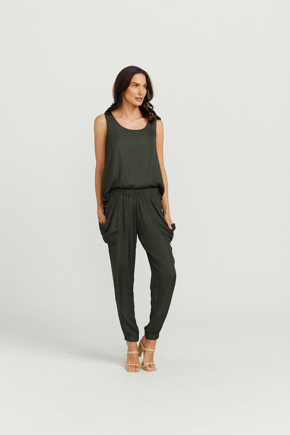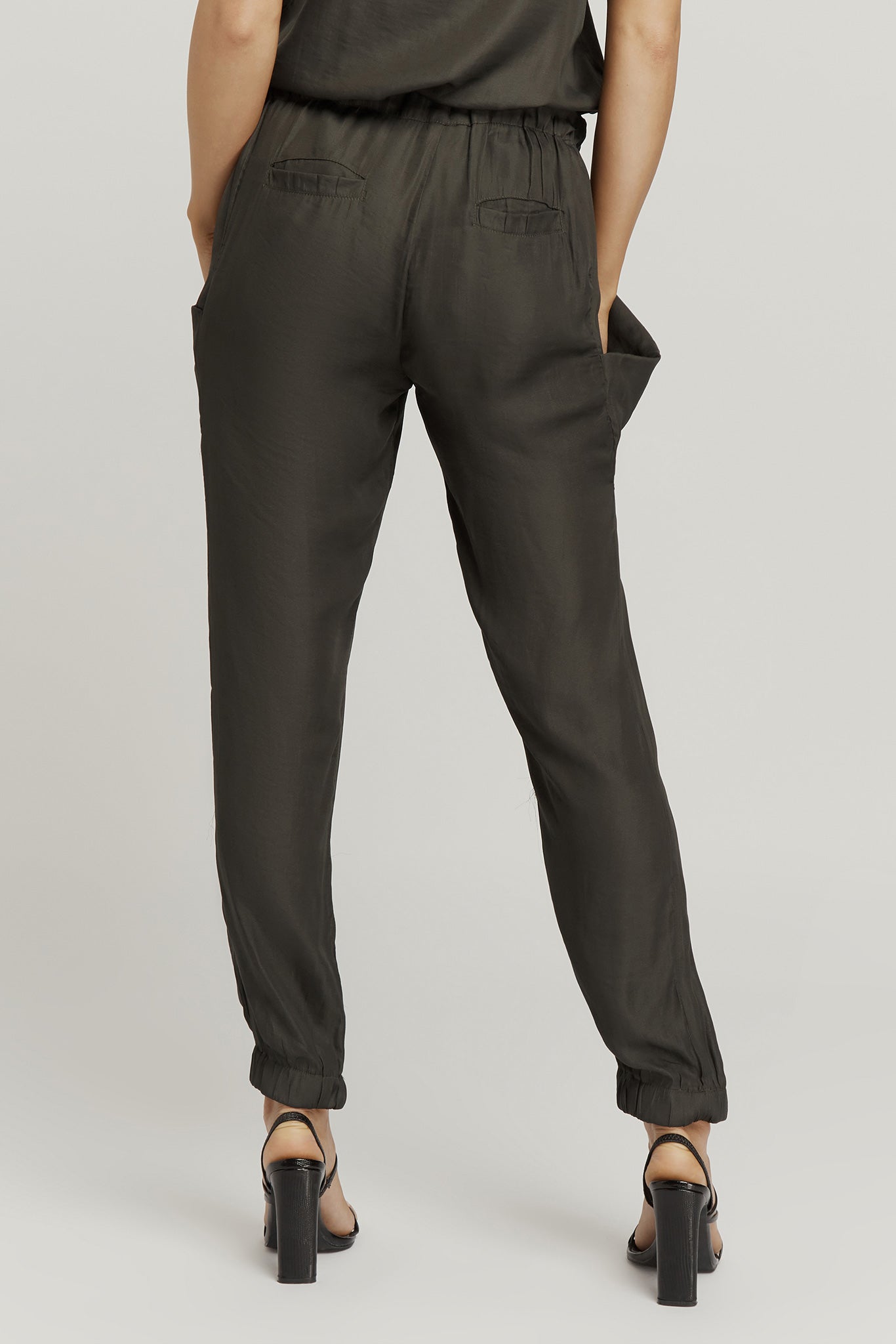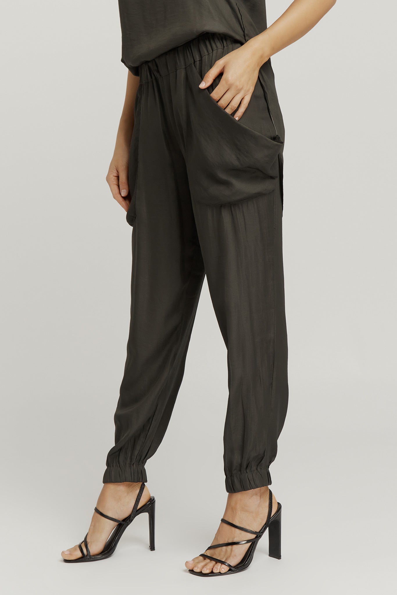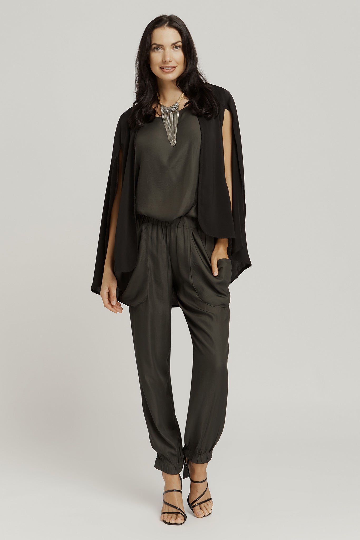 Elasticised at the ankles (NOT TIGHT) , nice and comfortable and elasticised waist with nice SLOUCHY pockets for that elegant, slouchy look and pocket detail on back of pant to give a nice taylored look at the same time!