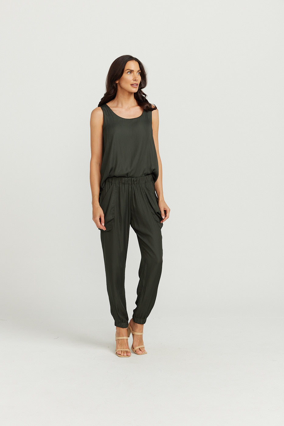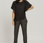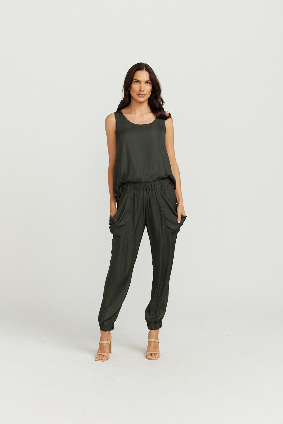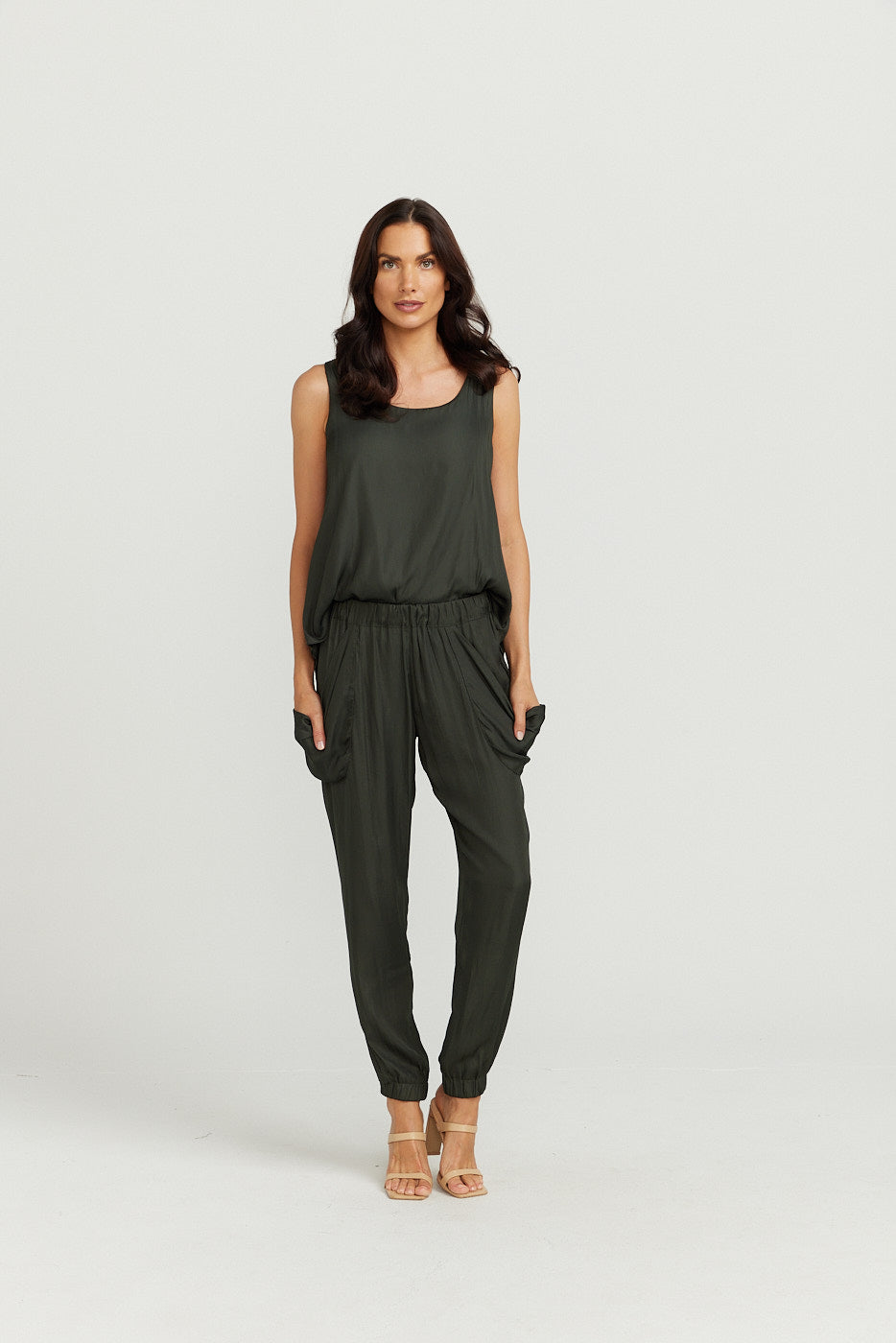 Elasticised at the ankles (NOT TIGHT) , nice and comfortable and elasticised waist with nice SLOUCHY pockets for that elegant, slouchy look and pocket detail on back of pant to give a nice taylored look at the same time!