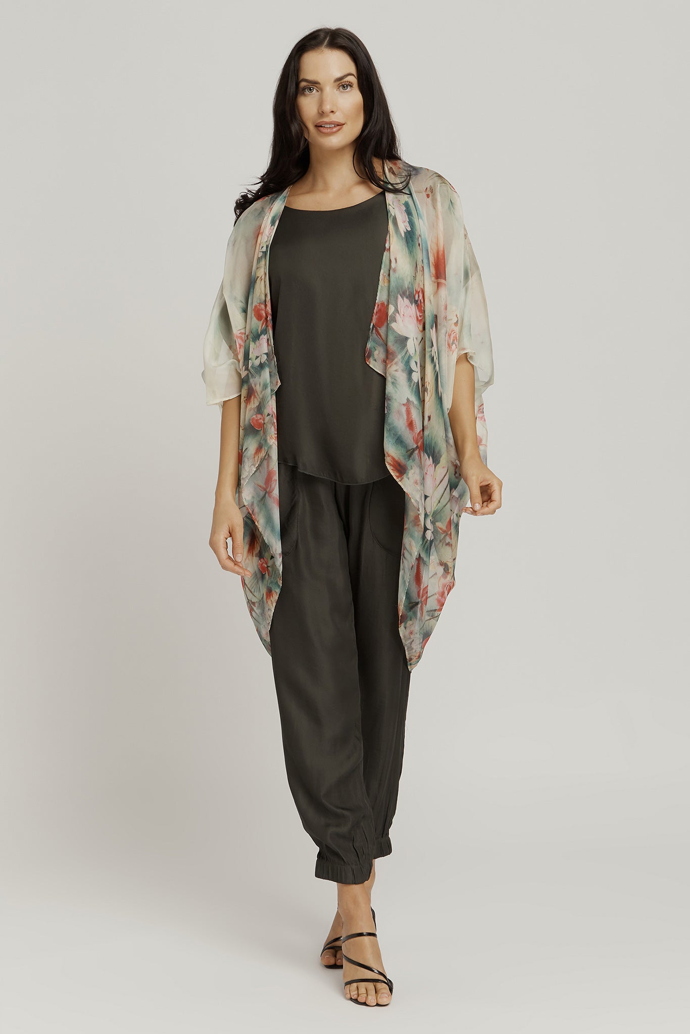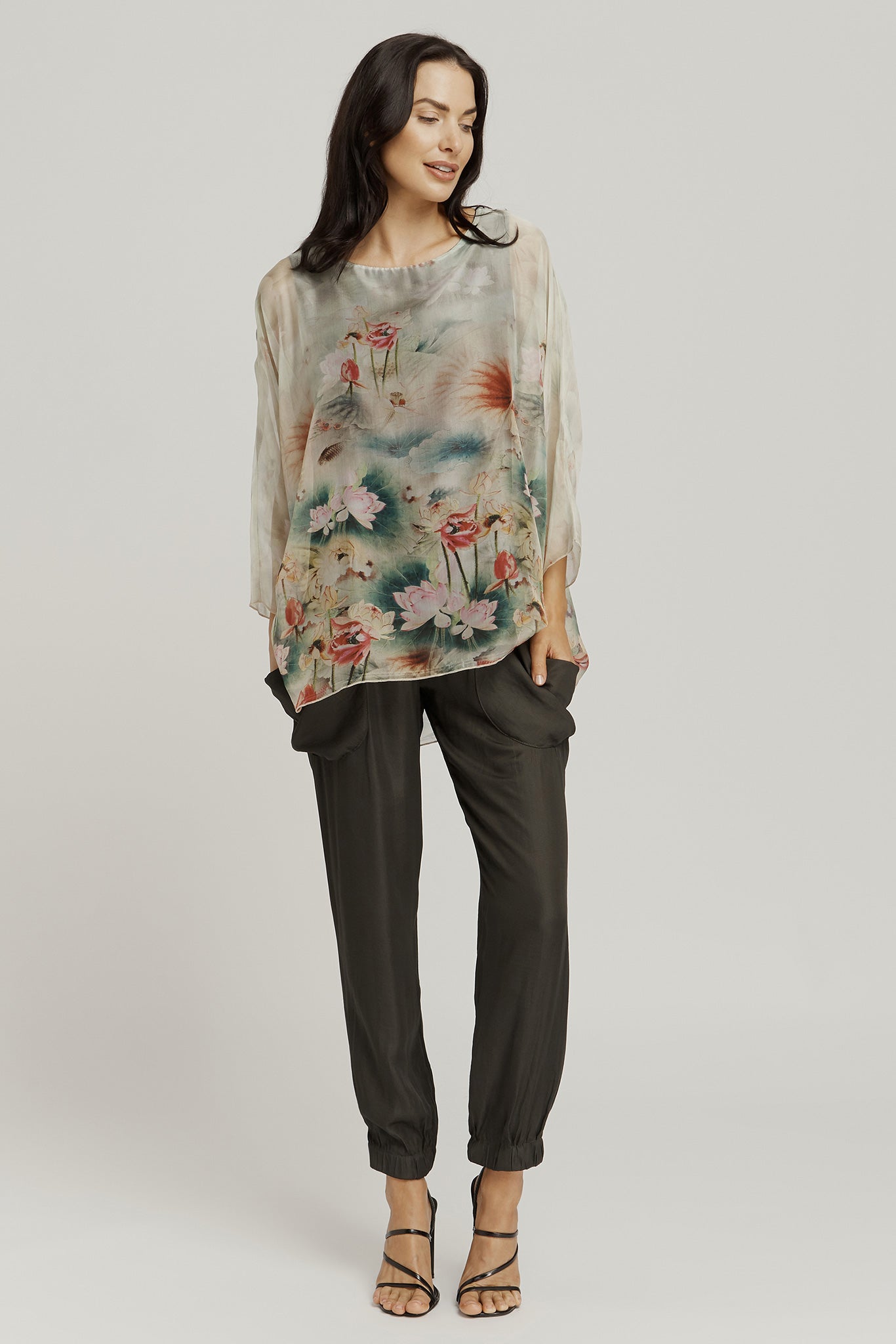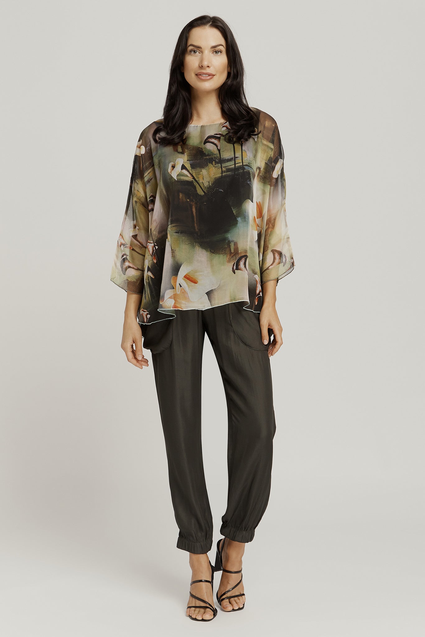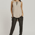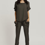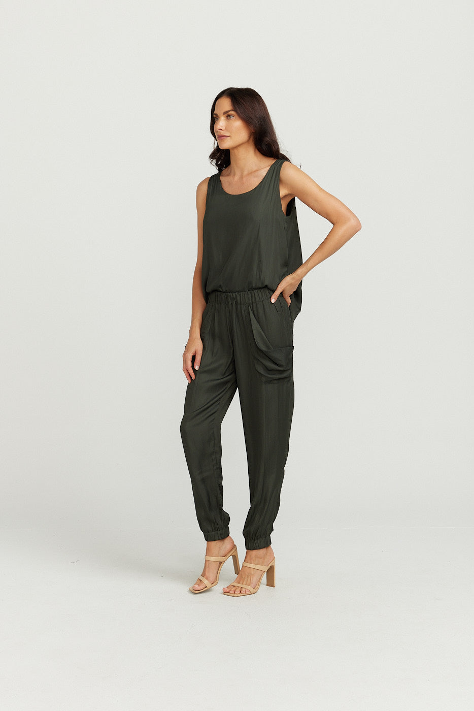 Elasticised at the ankles (NOT TIGHT) , nice and comfortable and elasticised waist with nice SLOUCHY pockets for that elegant, slouchy look and pocket detail on back of pant to give a nice taylored look at the same time!