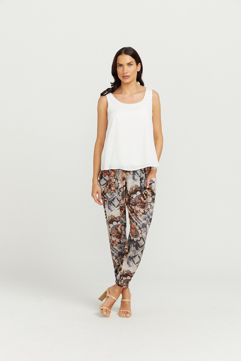 Elasticised at the ankles (NOT TIGHT) , nice and comfortable and elasticised waist with nice SLOUCHY pockets for that elegant, slouchy RELAXED look and pocket detail on back of pant to give a nice taylored look at the same time!