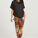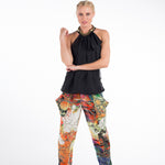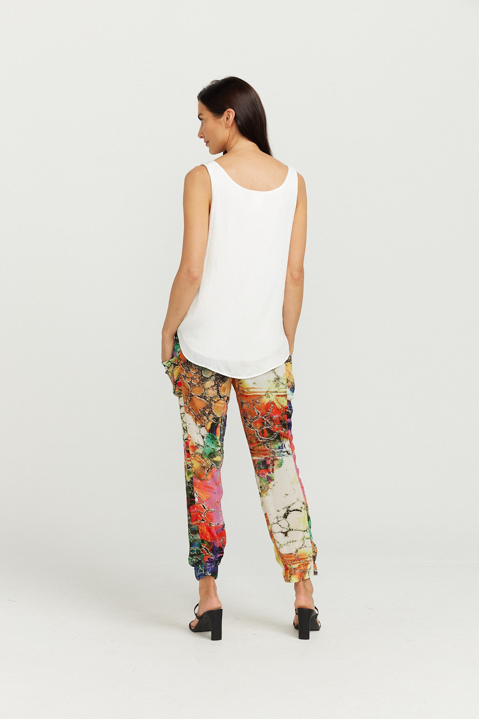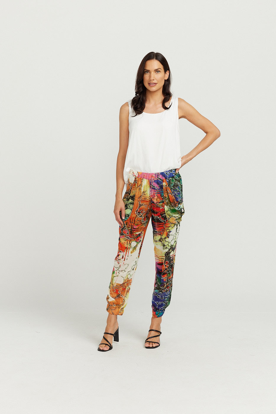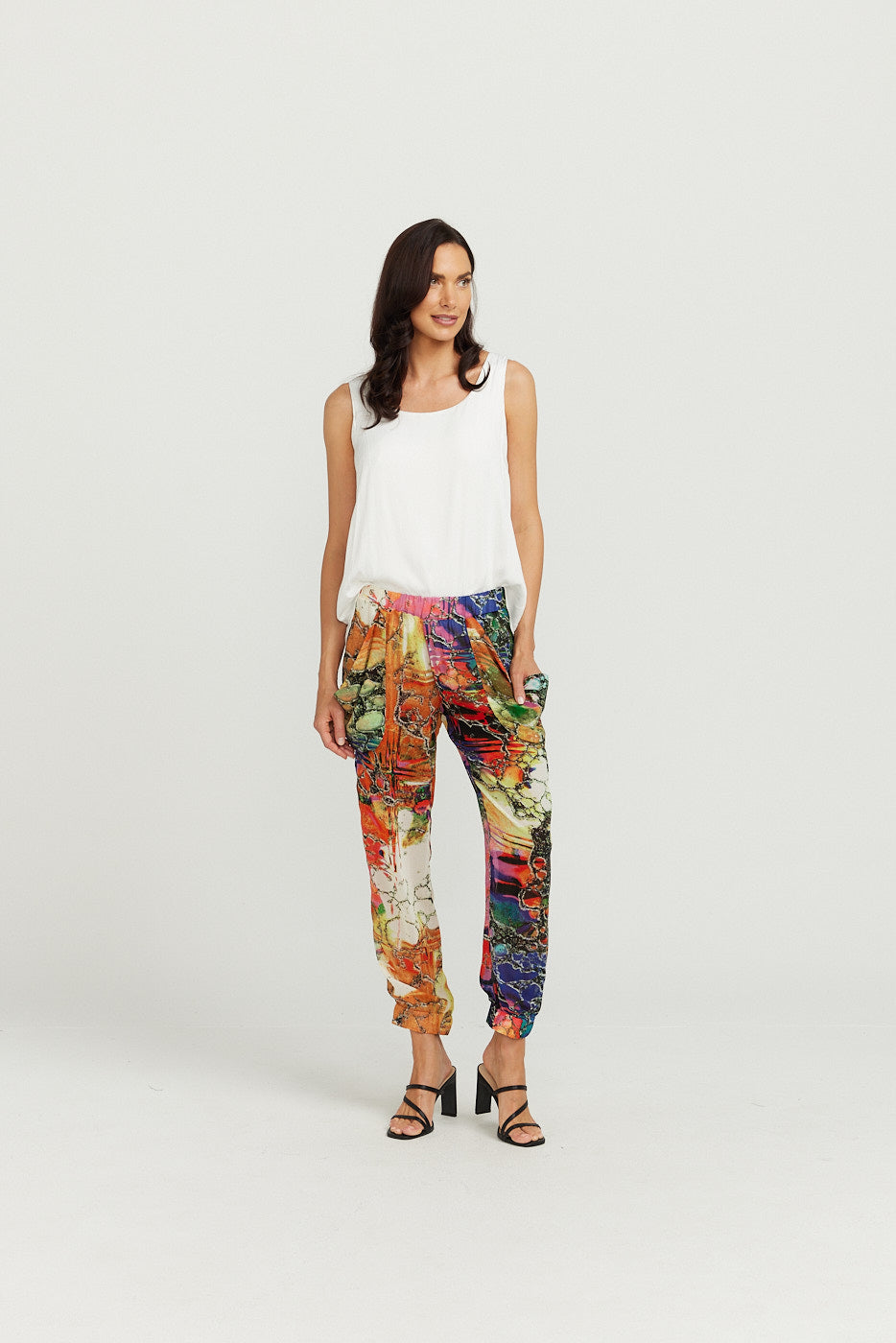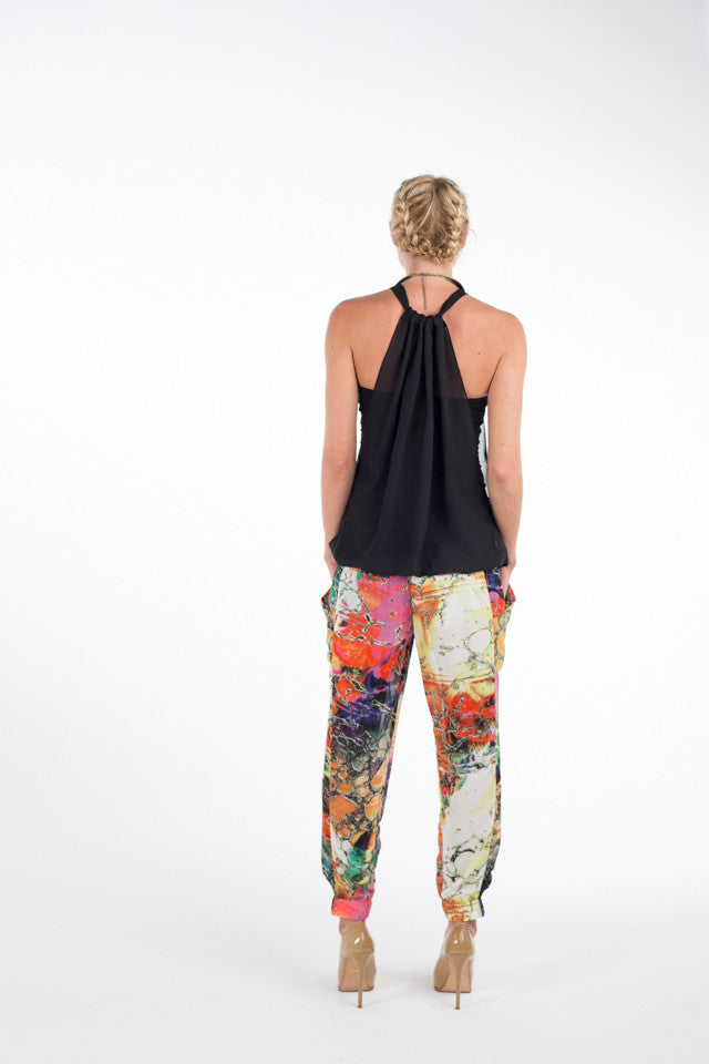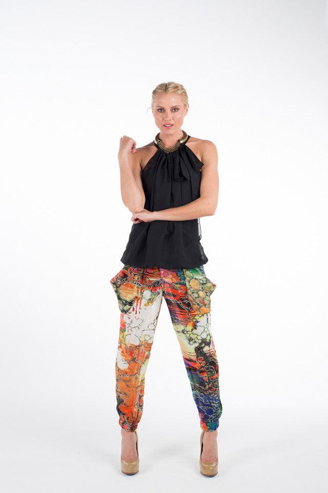 Elasticised at the ankles (NOT TIGHT) , nice and comfortable and elasticised waist with nice SLOUCHY pockets for that elegant, slouchy look and pocket detail on back of pant to give a nice taylored look at the same time!