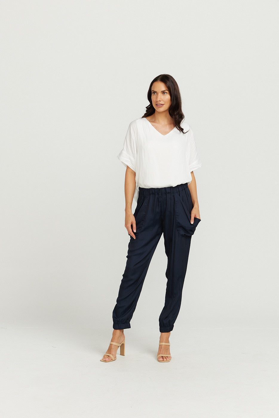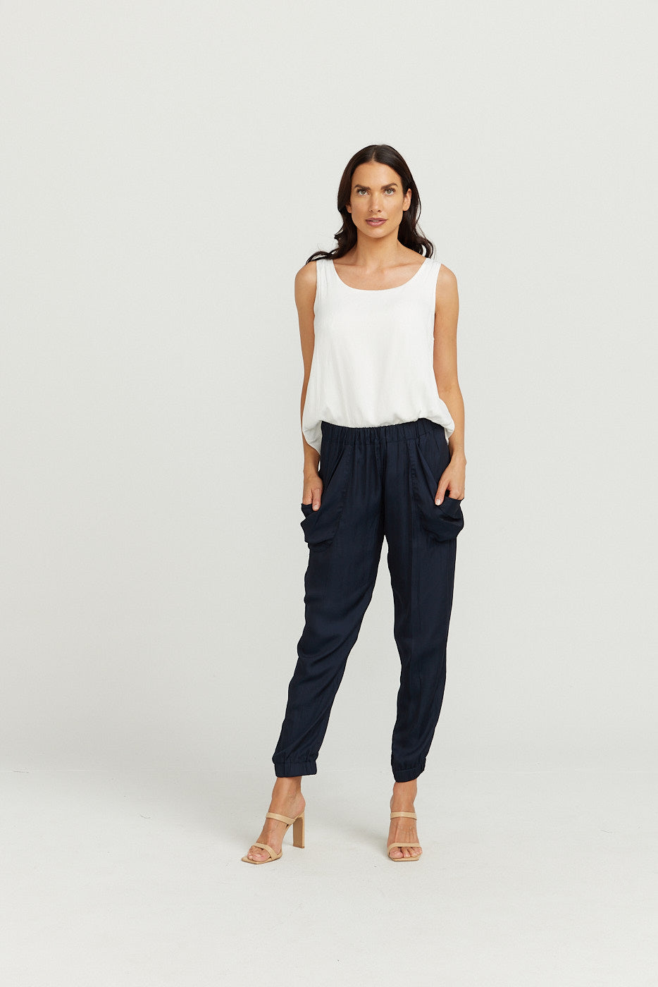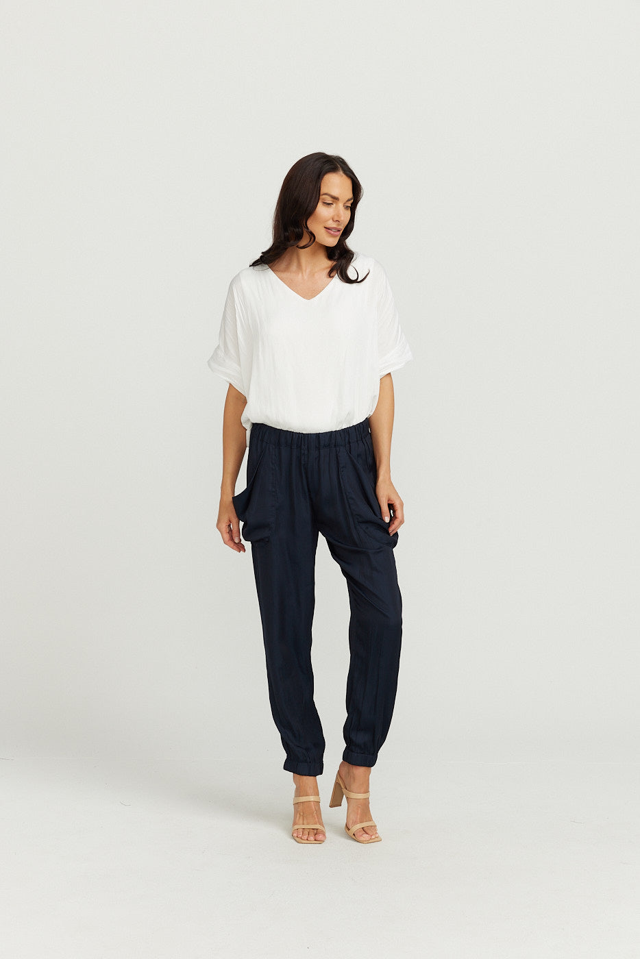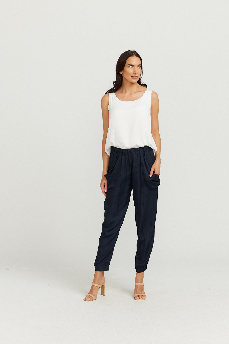 Elasticised at the ankles (NOT TIGHT) , nice and comfortable and elasticised waist with nice SLOUCHY pockets for that elegant, slouchy look and pocket detail on back of pant to give a nice taylored look at the same time!